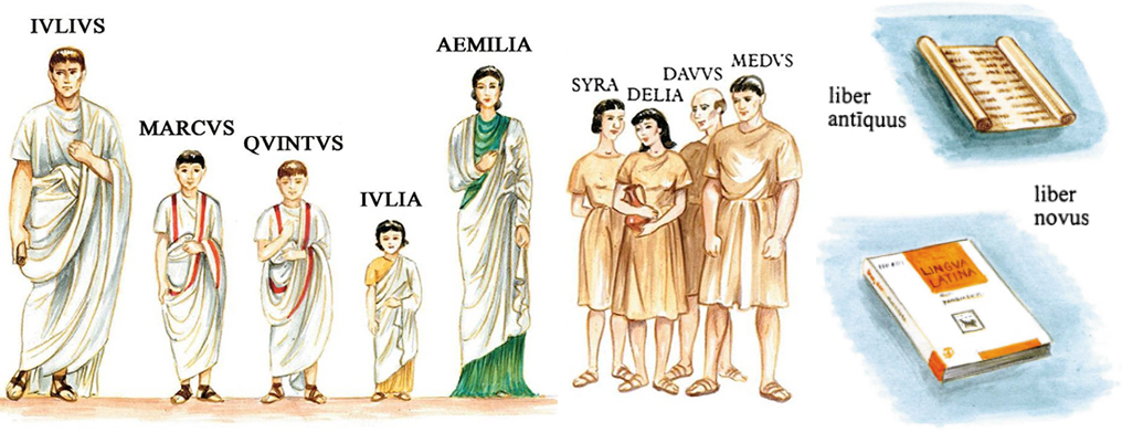 YOUR LATIN BOOK Behold two Latin books: an old book and a new book. LINGUA LATINA is your first Latin book. The title of your book is ‘LINGUA LATINA.’ Your book is not old, but it is new. In LINGUA LATINA there are many pages and many chapters: the first chapter, the second, the third, and so forth. ‘The Roman Empire’ is the title of the first chapter. The title of the second chapter is ‘Roman Family.’ In the second chapter there are six pages. On the first page of the second chapter there are many new words: vir, femina, puer, puella, familia, and so forth. The number of Latin words is large! |