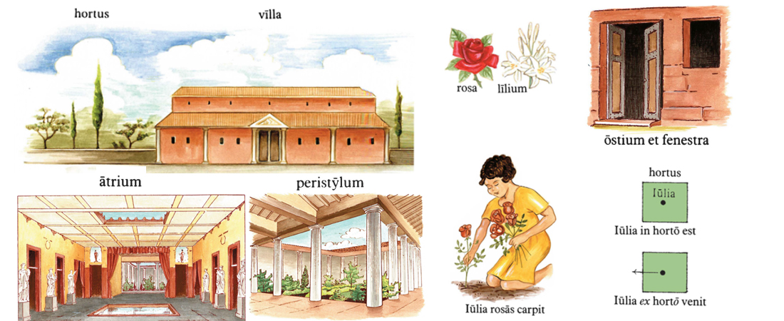 Ecce villa et hortus Iulii. Iulius in magna villa habitat. Pater et mater et tres liberi in villa habitant. Iulius et Aemilia tres liberos habent: duos filios et unam filiam - non duas filias. In villa multi servi habitant. Dominus eorum est Iulius: is multos servos habet. Ancillae quoque multae in villa habitant. Domina earum est Aemilia: ea multas ancillas habet. Iulius in villa sua habitat cum magna familia. Pater et mater habitant cum Marco et Quinto et Iulia. Iulius et Aemilia in villa habitant cum liberis et servis et ancillis. Villa Iulii in magno horto est. In Italia sunt multae villae cum magnis hortis. In hortis sunt rosae et lilia. Iulius multas rosas et multa lilia in horto suo habet. Hortus Iulii pulcher est, quia in eo sunt multae et pulchrae rosae liliaque. Aemilia femina pulchra est. Syra non est femina pulchra, neque pulcher est nasus eius, sed foedus est. Syra, quae bona ancilla est, nasum magnum et foedum habet. Iulius est vir Aemiliae, feminae pulchrae. Iulius Aemiliam amat, quia ea pulchra et bona femina est. Aemilia Iulium virum suum amat et cum eo habitat. Pater et mater liberos suos amant. Iulius non solus, sed cum Aemilia et cum magna familia in villa habitat. In villa sunt duo ostia: ostium magnum et ostium parvum. Villa duo ostia et multas fenestras habet. In villa Iulii magnum atrium est cum impluvio. Quid est impluvio? In eo est aqua. In atrio nullae fenestrae sunt. Etiam peristylum magnum et pulchrum in villa est. 'Peristylum' est vocabulum Graecum. In villis Graecis et Romani magna et pulchra peristyla sunt. Estne impluvium in peristylo? Id non in peristylo, sed in atrio est. In peristylo parvus hortus est. In villa sunt multa cubicula. Quintus in cubiculo parvo dormit. Estne magnum cubiculum Marci? Id quoque parvum est. Iulius et Aemilia in cubiculo magno dormiunt. Ubi dormiunt servi? Ii quoque in cubiculis dormiunt. Suntne magna eorum cubicula? Ea non magna sunt, et multi servi in uno cubiculo dormiunt. Etiam ancillae multae in uno cubiculo dormiunt, neque eae magna cubicula habent. - Aemilia in peristylo est. Estne sola? Aemilia sola non est: liberi cum ea in peristylo adsunt. Iulius abest. Aemilia sine viro suo Iulio in villa est. Ubi est Iulius? In oppido Tusculo est sine Aemilia, sed cum servis quattuor. |
