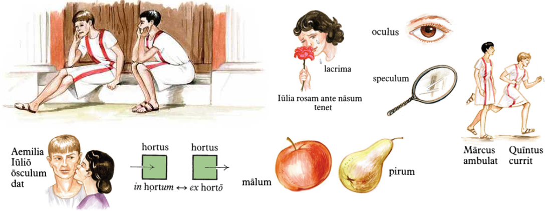 Aemilia cum Delia e peristylo in atrium intrat, laeta ad Iulium adit eumque salutat. Aemilia viro suo osculum dat. Iulius: “Quid agit Iulia?” Aemilia: “Rosas carpit in horto.” Iulius: “Currite in hortum, pueri, et vocate eam!” Quintus currit. Marcus non currit, sed ambulat. Iulius imperat: “Age! Curre, Marce!” Etiam Marcus currit. Pueri per peristylum in hortum currunt. Illic autem puella non est. Pueri ex horto per peristylum in atrium ambulant. Marcus: “Iulia neque in horto neque in peristylo est.” Aemilia: “Estne Syra in horto?” Quintus: “Non est. Nulla ancilla illic est.” Aemilia: “Non solum Iulia, sed etiam Syra abest! Delia, i ad cubiculum Iuliae!” Delia ad cubiculum Iuliae it, ostium pulsat, aperit, in cubiculum intrat. Illic non solum Iulia, sed etiam Syra est. Oculi Iuliae pleni sunt lacrimarum. Delia: “Veni in atrium, Iulia! Illic pater tuus te exspectat.” Iulia oculos et nasum terget, rosam sumit, e cubiculo exit. Syra et Delia post eam exeunt. Iulia in atrium ad Iulium currit eique osculum dat. Iulia: “Ecce rosa. Nonne pulchra est haec rosa?” Iulius: “Nulla rosa tam pulchra est quam filia mea!” Iulius filiae suae osculum dat. Iamne lacrimat Iulia? Immo laeta est et ridet. Iulia: “Num nasus meus foedus est?” Iulius: “Foedus? Immo tam formosus est quam - hoc malum! Ecce malum tuum, Iulia.” Pater filiae malum magnum et formosum dat. Iulia malum terget et ante oculos tenet. Iulia: “O, quam formosum est hoc malum!” Puella laeta malo suo osculum dat! Iulius: “Hoc pirum etiam tuum est, Iulia.” Iulius ei pirum dat. Iam puella et malum et prium habet. Aemilia: “Etiam ancillis meis mala et pira da!” Iulius ancillas ad se vocat et iis quoque mala et pira dat. Ancillae laetae ex atrio exeunt. - Cui Iulius malum dat? Puero malum dat. Puer cui Iulius malum dat est filius eius. Cui Iulius osculum dat? Puellae osculum dat. Puella cui Iulius osculum dat filia eius est. |
