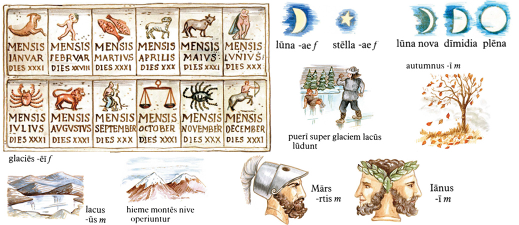 Nocte sol non lucet, sed luna et stellae lucent. Luna ipsa suam lucem non habet, lux lunae a sole venit; itaque luna non tam clara est quam sol. Sol est stella clarissima, quae luce sua et terram et lunam illustrat. Neque tota luna sole illustratur, sed tantum ea pars quae vertitur ad solem; cetera pars obscura est. Cum exigua pars lunae tantum videtur, luna 'nova' esse dicitur. Die septimo vel octavo post lunam novam luna dimidia videtur, quae formam habet litterae D. Die quinto decimo post lunam novam luna plena est et formam habet litterae O. Cum luna non lucet, nox obscura est. Dies mensis primus 'kalendae' nominatur. Dies primus mensis Ianuari dicitur 'kalendae Ianuariae'; is dies anni primus est atque initium anni novi. Diei primo mensis Iulii 'kalendae Iuliae' nomen est; is est dies anni medius. Dies tertius decimus post kalendas 'idus' nominatur. 'Idus Ianuariae' dies tertius decimus est post kalendas Ianuarias. Item 'idus Februariae' dicitur dies tertius decimus mensis Februarii. Sed 'idus Martiae' dies est quintus decimus mensis Martii, nam mense Martio (item Maio, Iulio, Octobri) idus non dies tertius decimus, sed quintus decimus post kalendas est. Dies nonus ante idus dicitur 'nonae' (nonae Ianuariae: dies quintus Ianuarii; nonae Februariae: dies quintus Februarii; nonae Martiae: dies septimus Martii; cet.) |
