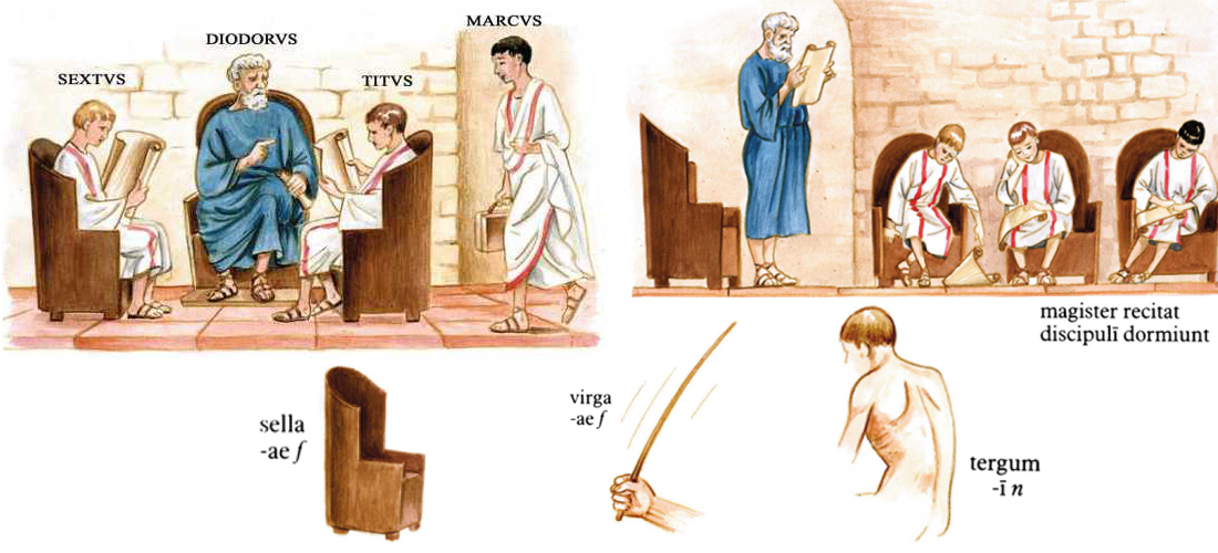 Marcus walks to Tusculum carrying his book, tablet and other things. That is the boys' school. Many boys go to school in the morning. The school's teacher is a Greek man, whose name is Diodorus. Marcus fears the teacher, for Diodorus is a strict teacher, who beats his students with a rod; he is not only strict he is accustomed to punish bad students. Students are boys who go to school. Marcus and Quintus are two students. Other students are Titus and Sextus. Sextus who arrives to school before Marcus and Titus, enters the school first. Sextus is alone, for the other students have not arrived yet. The teacher enters seeing Sextus sitting alone in his seat. Sextus gets up from his seat and greets the teacher: "Hail teacher!" Teacher: "Hail Sextus! Sit down!" Sextus sits in his seat. The student sits quietly in front of the teacher. The teacher asks: "Why are you alone Sextus?" Sextus answers, "I am alone, because all the other students are absent." The teacher shouting: "O bad students...!" Sextus: "Surely I am not a bad student am I?" Teacher: "On the contrary you are a good student Sextus, but Marcus, Quintus and Titus are bad!" Now Titus arrives at school and knocks on the door before entering: students do not immediately enter, but first knock on the door; then enter the school and greet the teacher: "Hail teacher!" Teacher: "O Titus! Sextus is here already..." Titus: "But Marcus and Quintus are not here yet!" Teacher: "Be silent boy! Close the door and sit down! Open your books boys!" Sextus immediately opens his book, but Titus, who does not have a book says, "I do not have a book." Teacher: "What? Sextus has his book, you not have your book? Why don't you have your book?" Titus: "I don't have my book, because Marcus has my book." |