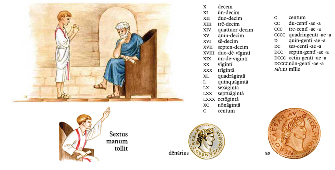 In ludo pueri numeros et litteras disciunt. Magister pueros numeros et litteras docet. Magister pueros multas res docere potest, nam is multas res scit quas pueri nesciunt. Magister est vir doctus. Pueri adhuc indocti sunt. Qui paulum aut nihil discere potest, stultus esse dicitur. Qui discere non vult atque in ludo dormit, piger esse dicitur. Discipulus qui nec stultus nec piger est, sed prudens atque industrius, multas res a magistro discere potest. - Magister Diodorus recitare desinit et pueros aspicit, qui taciti stant ante suam quisque sellam; nemo eorum dormit. Magister discipulum quemque considere iubet, primum Sextum, deinde Titum, postremo Marcum. Magister: “Nunc tempus est numeros discere. Primum dic numeros a decem usque ad centum!” Quisque puer manum tollit, primum Sextus, tum Titus, postremo Marcus. Magister Titum interrogat. Titus: “Decem, undecim, duodecim, tredecim, quattuordecim, quindecim, sedecim, septendecim, duodeviginti, undeviginti, viginti, viginti unus, viginti duo...” Hic magister eum interpellat: “Necesse non est omnes numeros dicere; a viginti dic decimum quemque numerum tantum, Tite!” Titus: “Viginti, triginta, quadraginta, quinquaginta, sexaginta, septuaginta, octoginta, nonaginta, centum.” Magister: “Bene numeras, Tite. Iam tu, Sexte, dic numeros a centum ad mille!” Sextus: “Longum est tot numeros dicere!” Magister: “At satis est decem numeros dicere, id est centesimum quemque.” Sextus: “Centum, ducenti, trecenti, quadringenti, quingenti, sescendi, septingenti, octingenti, nongenti, mille.” Magister: “Quot sunt triginta et decem?” Omnes pueri simul respondent, nemo eorum manum tollit. Titus et Sextus uno ore dicunt: “Quadraginta.” Marcus vero dicit: “Quinquaginta.” Quod Marcus dicit rectum non est. Responsum Titi et Sexti rectum est: ii recte respondent. Responsum Marci est pravum: is prave respondet. |