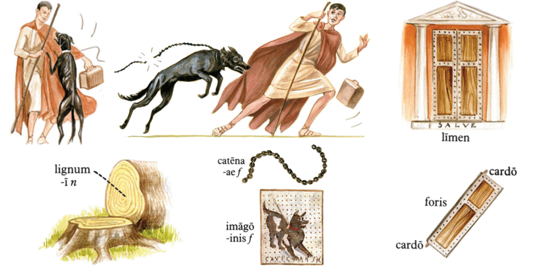 Tandem ianitor fores aperit et Tlepolemum foris in imbre stantem videt. Canis iratus dentes ostendit ac fremit: “Rrrr...!” nec vero tabellarium mordere potest, quod catena retinetur. Ianitor: “Cave! Canis te mordebit!” Sic ianitor hominem intrantem de cane feroci monet. Tlepolemus in limine resistens “Retine canem!” inquit, “Noli eum solvere! Nec vero opus est me monere de cane, ego enim legere scio.” Tabellarius solum intra limen aspicit, ubi CAVE CANEM scriptum est infra imaginem canis ferocis. “Neque haec imago neque canis verus me terret!” inquit, et propius ad canem accedit. “Mane foris!” inquit ianitor, “Noli ad hunc canem accedere! Iam te monui!” Tabellarius vero, quamquam sic a ianitore monitus est, alterum gradum ad canem versus facit - sed ecce canis in eum salit catenam rumpens! Homo territus ex ostio cedere conatur, sed canis iratus pallium eius dentibus prehendit et tenet. “Ei! Canis me mordet!” exclamat tabellarius, qui iam neque recedere neque procedere audet: canis fremens eum loco se movere non sinit. Ianitor ridens “Quin procedis?” inquit, “Noli resistere! Ego te intrare sino. Ianuam aperui. Procede in villam!” Sic ianitor virum territum deridet. “Id facilius est dictu quam factu” inquit tabellarius, atque alterum gradum facere audet, sed canis statim in pedes posteriores surgit atque pedes priores in pectore eius ponit! Tabellarius, toto corpore tremens, ex ostio cedit: sic canis eum e villa pellit. “Remove canem!” inquit ille, “Iste canis ferox me intrare non sinit.” Ianitor eum tremere animadvertit iterumque deridet: “Quid tremis? Hicine canis te terruit?” Tlepolemus: “Noli putare me ab isto cane territum esse! Si tremo, non propter canem ferocem, sed propter imbrem frigidum tremo. Admitte me sub tecum, ianitor - amabo te! Vinci istum canem ferocem! Cur eum solvisti?” Tabellarius enim canem a ianitore solutum esse arbitratur. Ianitor catenam manu prehendit canemque paulum a tabellario removet. “Noli arbitrari” inquit “me canem solvisse. Canis ipse catenam suam rupit. Ecce catena rupta.” Tlepolemus: “Num canis catenam ferream rumpere potest? Id non credo. At certe vestem scindere potuit: videsne pallium meum novum, quod nuper magno pretio emi, scissum esse a cane tuo?” Ianitor: “Istud pallium non est magni pretii, neque id nuper emptum esse credo. Sed quid tu venisti? Num quid tecum fers?”