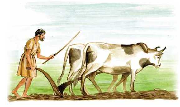 The god of farmers is Saturn, who was once king of the sky, but knocked from the sky by his son Jove he came into Italy, where he ruled greatly that region which is called Latium and taught the Latins, men that then were rude and barbaric, to cultivate the fields. In the Roman forum there is a temple to Saturn. A field that can bear much grain or other crops is said to be fertile. Italy is a fertile land, but many places in Italy are not plowed nor do they bear any crops besides grass. Those places feed sheep, pigs, and oxen, for grass is the food of cattle, and it is easier to feed cattle than to cultivate fields. Besides the wool of sheep is used by men, for from wool clothes are made. Therefore cattle is more valuable than grain, and he who feeds cattle makes more money than he who cultivates fields. |