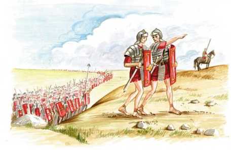 "Aemilius sends greetings to his very dear sister Today at last I received your letter that has been writted seven days before Kalends of May, that is twenty days ago. How late that postman is! Certainly the mountains that separate Gemany and Italy are tall and difficult, and the roads are very difficult that lead across the Alps, but nevertheless a faster postman can make the same journey is about fifteen days, as the public postman used by our leader. But I will teach that postman to hurry when he brings my letters to you. But even though it arrived late, your letter was very pleasing to me and with great joy I learned that you, Julius and your children, whom I love greatly, enjoy good health. When I read your letters, I seem to be with you in Alban, and not in this frigid land among barbarians. Then, I don't know how, I was thus moved that I could harldy hold back tears - thus I miss my country and friends. O, how long I have been away from Italy and especially from all of those whom I love! Would that I had been in Rome or you had been with me! When I see the Danube river, which flows beside our camp, I think of the Tiber and of Rome. When will I see you, beautiful city? Would that this river had been the Tiber and this camp had been in Rome! But I hope this in vain, since no one besides a god can transport immediately into another place. If I was Mercury and had wings, I would fly with a swift wind across the mountains and rivers into Italy, where Venus, my most beautiful sister, would receive her brother with a laugh. You will certainly laugh my sister, but without reason, for it is not fitting to hope for such a ridiculous thing nor to shed tears for soldier whose duty is to shed blood for his country. But even though I am eager to see my country, I will fulfill my duty just as other Roman soldiers, of which there is a large number in Germany. Unless we were here and defending the empire, the enemy might quickly cross the Danube and Alps and come into Italy, and you would not be safe in Latinum. To prevent that from happening, the Roman legions are here and will remain as long as an armed enemy is left on this side of the Danube river or beyond. Therefore since I cannot hurry to you myself, I will hurry to write letters to you. You asked me why I wrote only one letter to you, when I received three or four letters from you. It is not difficult to excuse me because I have been negligent in writing. If only I had as much leisure as you, I am not as diligent as you in writing letters. But since I've barely had to sleep for several months, you will easily understand that I had no leisure time to write a letter. Almost everyday the Germans have attacked our camp or we made an attack against them. But today we saw no armed enemy on that side of the river. A large number of them were either killed or captured by our men, the remaining are hiding beyond the river in the great forest. For yesterday we overcame the German army in battle. This is what happened: |
